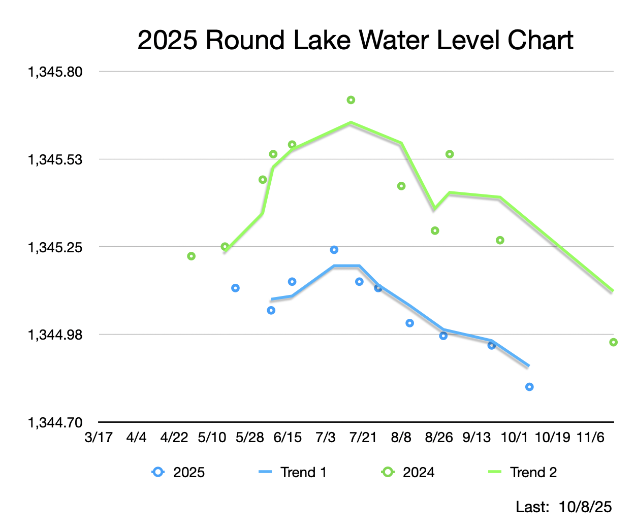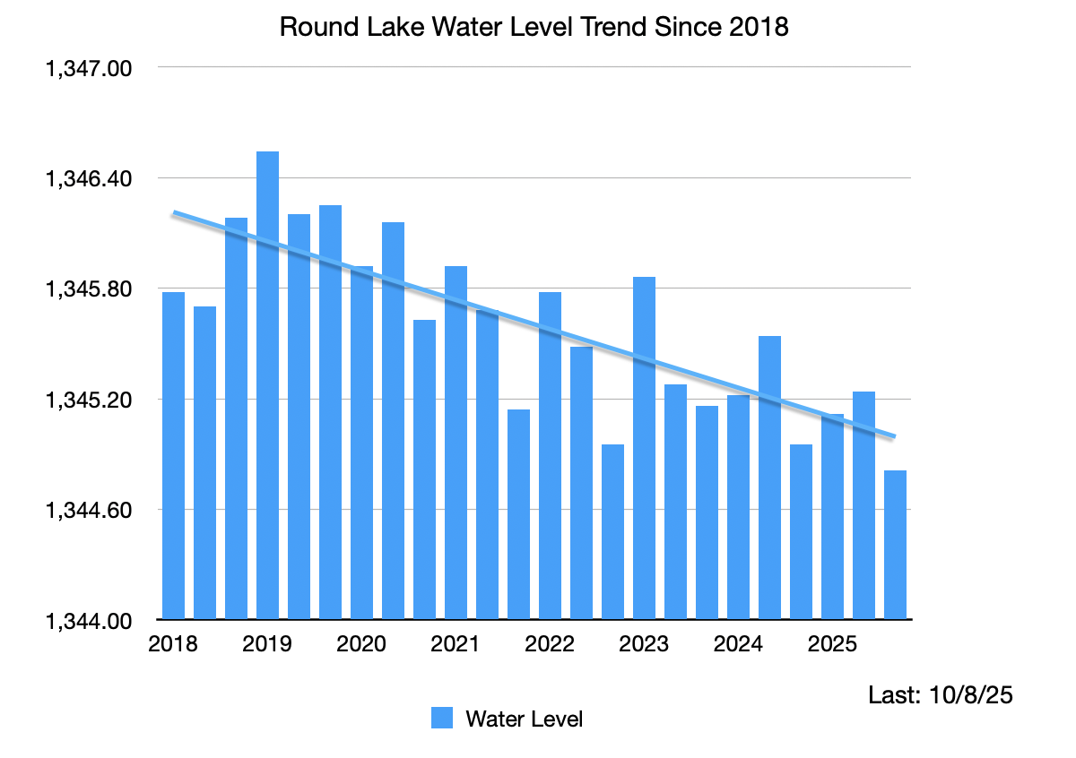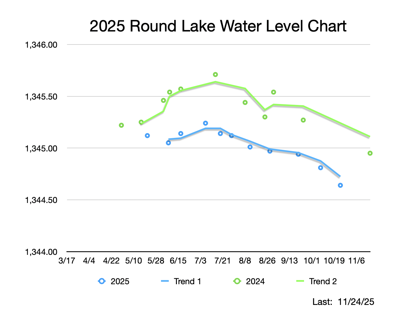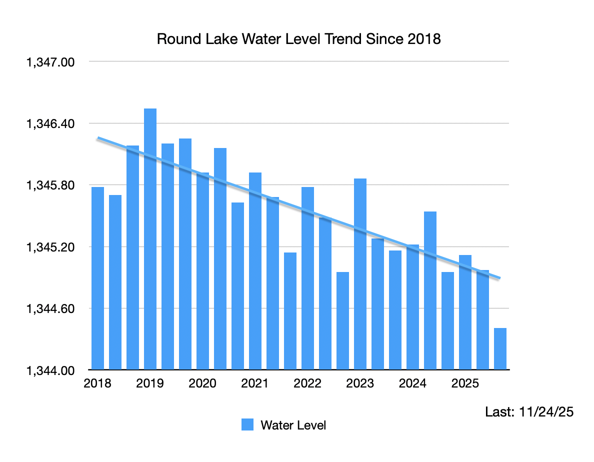 The lake level today was 1,344.95 ft. above sea level which is the lowest since I started taking readings in early 2018. The last time the lake was this low was in Nov. 2012, a reading taken by Bob Sosnowski. If you think the lake is currently really low consider the following; in historical records forwarded to me from Tom Wolf, I found a reading of 1,340.51 taken in 1933. This was during of the American Dust Bowl. That level was 4.5 feet lower (53.28 inches) from where we are today!!!