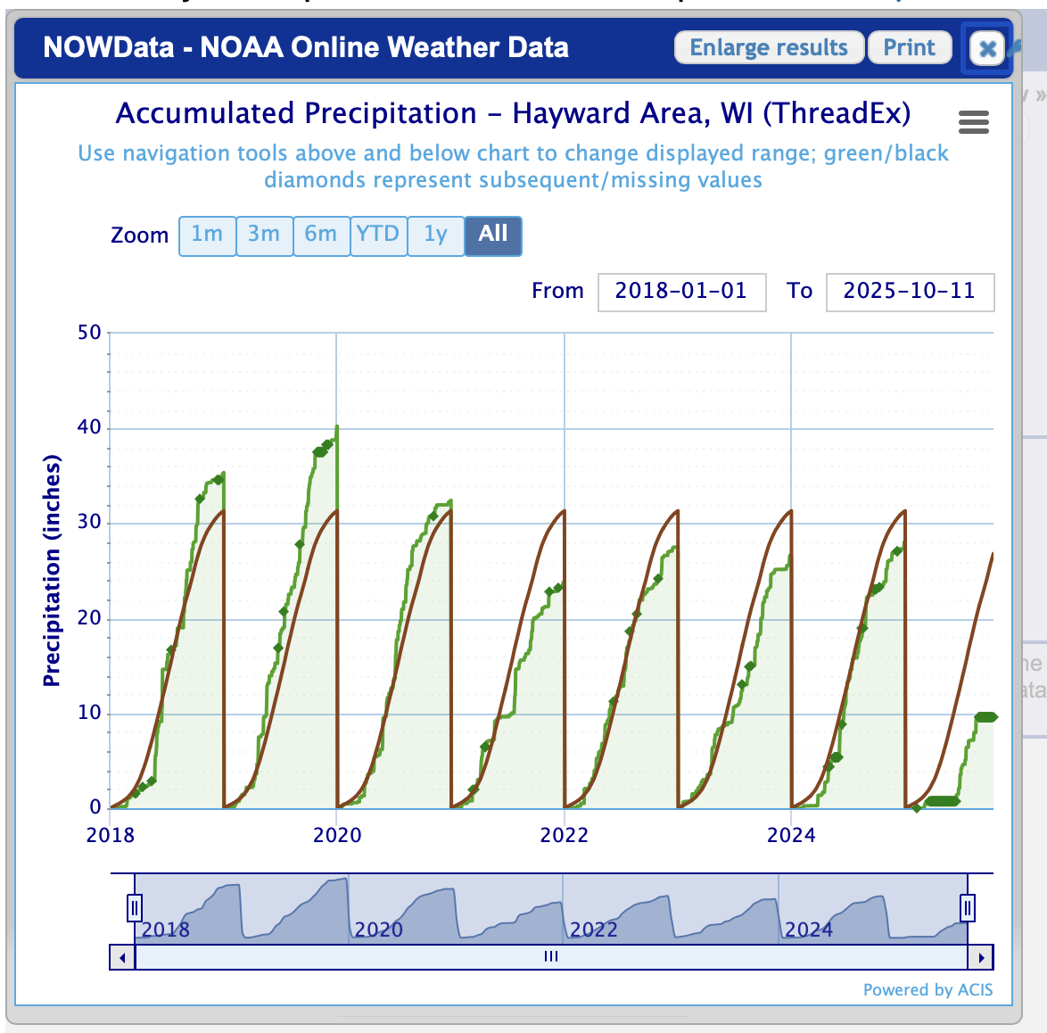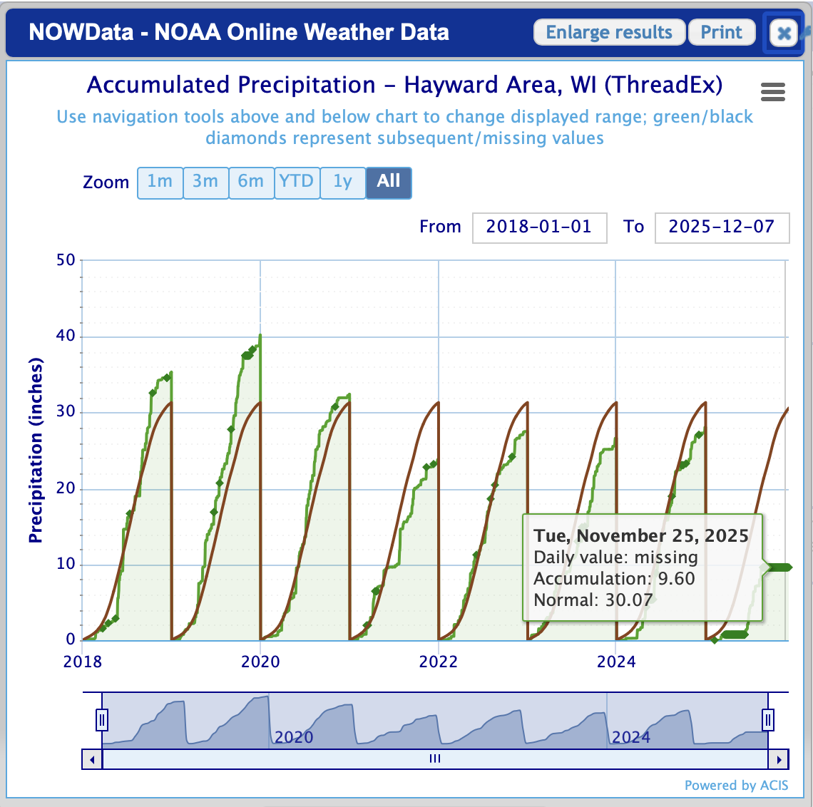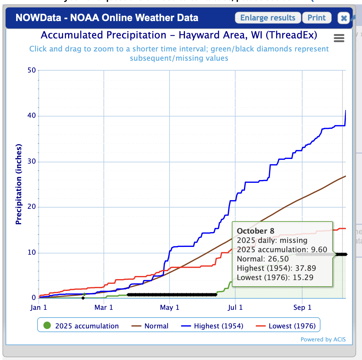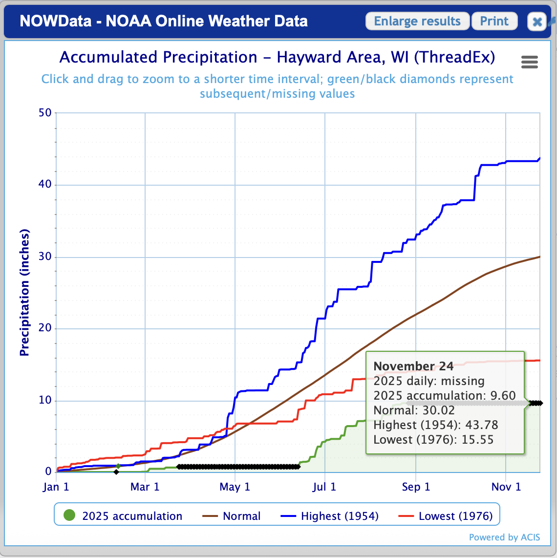 The lake level today was 1,344.95 ft. above sea level which is the lowest since I started taking readings in early 2018. The last time the lake was this low was in Nov. 2012, a reading taken by Bob Sosnowski. If you think the lake is currently really low consider the following; in historical records forwarded to me from Tom Wolf, I found a reading of 1,340.51 taken in 1933. This was during of the American Dust Bowl. That level was 4.5 feet lower (53.28 inches) from where we are today!!!